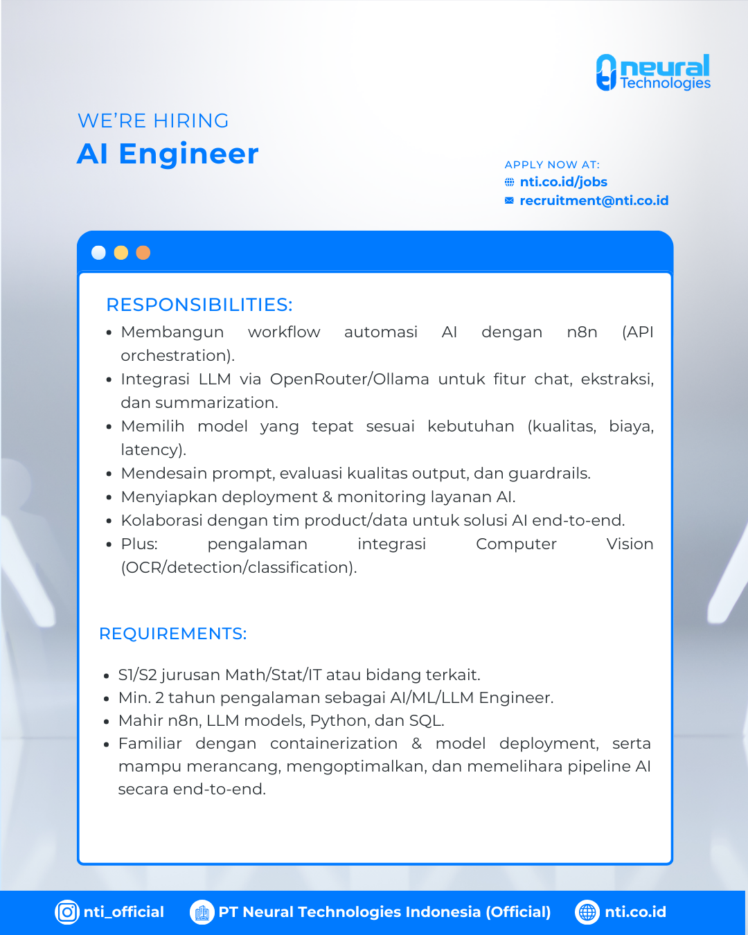 Are you an AI/ML Engineer with strong capability in model deployment, automation pipeline, dan LLM integration? Saatnya berkontribusi dalam membangun layanan AI yang scalable dan high-performance bersama PT Neural Technologies Indonesia.